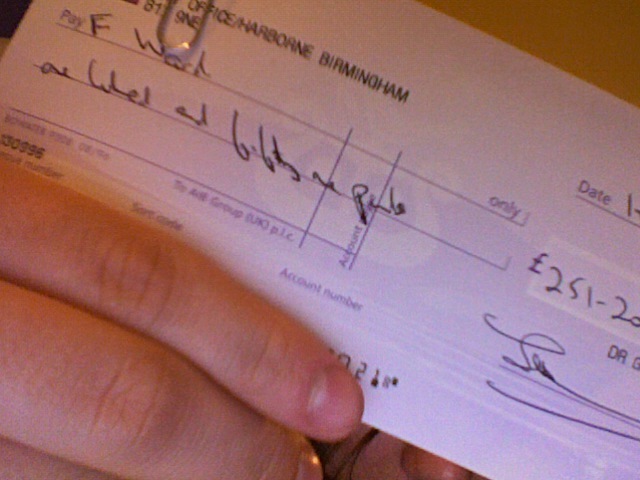 The incorrect cheque (bank details covered) Frankie Ward July 16, 2009 Published by Frankie Ward View all posts by Frankie Ward Published July 16, 2009