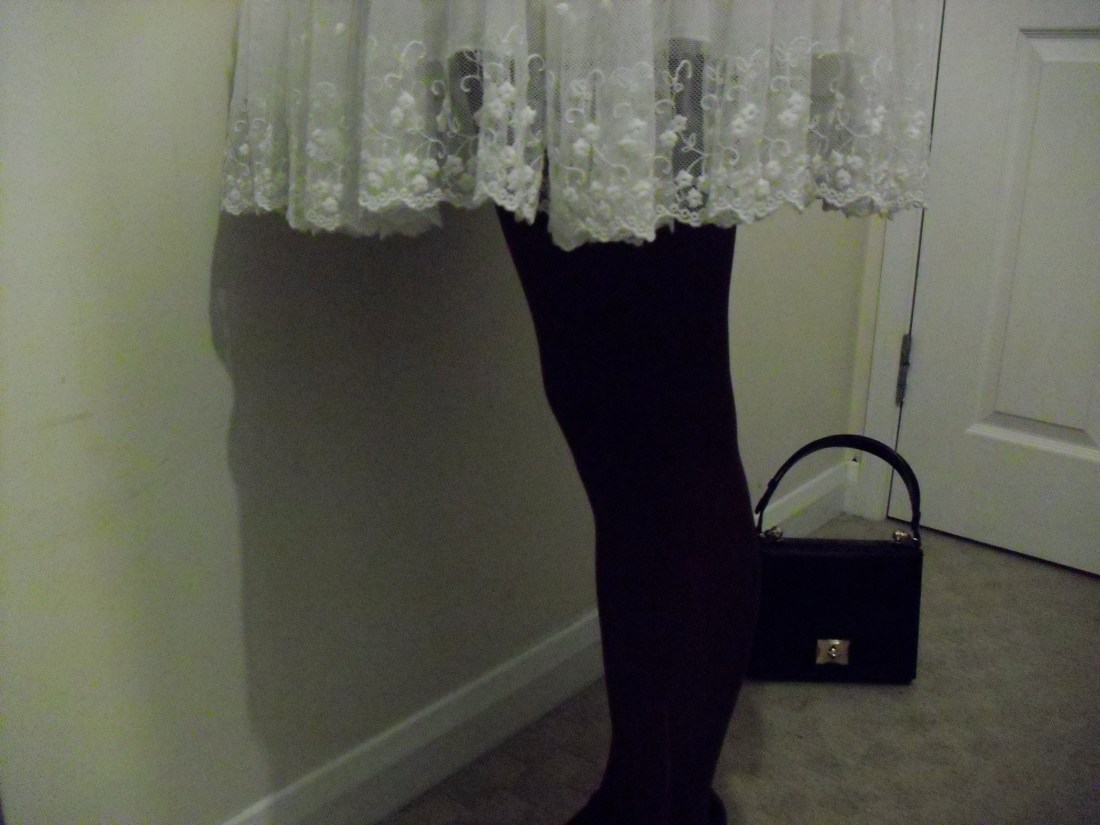 I had to wear this dress with a modesty-sparing nude camisole underneath because the fabric is so unwearably sheer! To protect my lower half I donned tights and a tutu that I bought from the kids section of H&M a few years back. It makes the skirt look huge, but I quite like how that takes the outfit from overly demure into something curious for the evening.